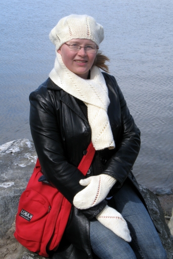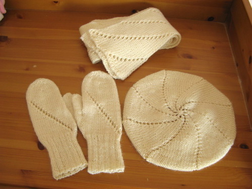 Tässä ohjeessa olevien kuvien neuleet ovat vasenkätisen neulojan tekemiä, ja kuvat on peilattu kuvankäsittelyohjelmassa niin, että ne näyttävät oikeakätisen neulojan tekemiltä. Jos vasenkätinen neuloja noudattaa ohjeita muuntamatta niitä, tulevat hyrrän kierteet ja lapasten ja kaulaliinan reikärivit toiseen suuntaan.