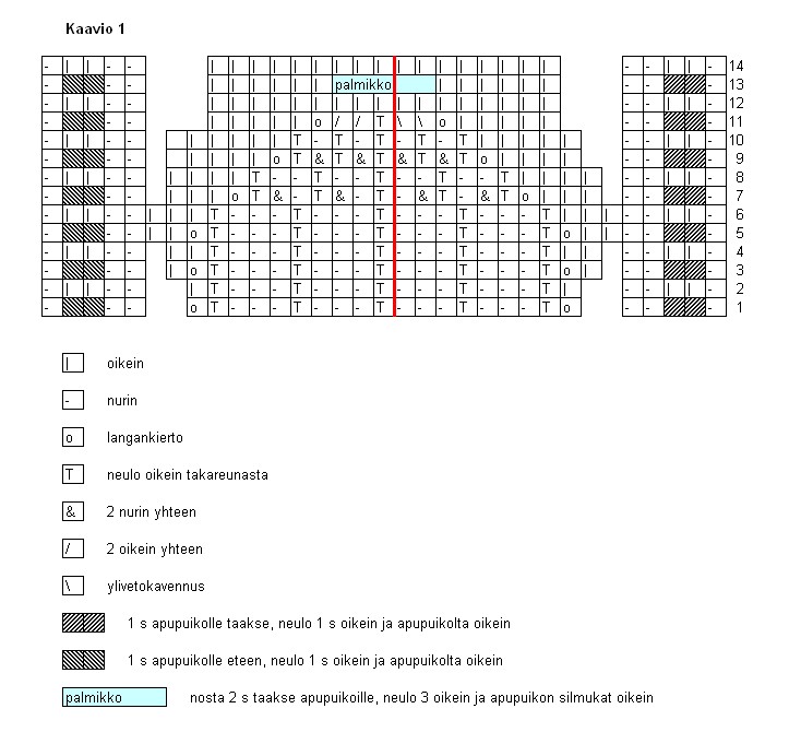 Jatka sen jälkeen 1. ja 4. puikolla 1 o, 1 n -joustinneuletta ja aloita 2. ja 3. puikoilla kaavion 1 kerrokselta 1. Toista kaavio yhteensä 3 kertaa (kerrokset 1-14).