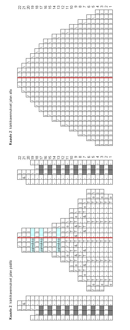 Jatka neulomista, kunnes olet neulonut mallikerran 6 kertaa 2. ja 3. puikolla. Neulo viimeiseksi kerros 14 ja neulo sitten kaavio 2, jossa on kärkikavennukset. Kavennuksia varten on selvyyden vuoksi eri kaaviot jalkapohjaa ja jalkapöytää varten.