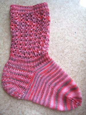 Makuuhuoneessamme huomasin äitini Leenan neulomat pitsivartiset sukat. Äitini tekee tietenkin ne ainoat oikeat sukat (kenenpä sukkia neulova äiti tai mummo ei tekisi?), joten päätin tutkia tarkemmin hänen sukkiaan. Koska nämä sukat ovat pitsineuleen takia hienommat kuin äidin tavalliset joustinneulevartiset sukat, annoin sukille nimeksi Leenan fiinimmät sukat. Pitsineuleen silmukkamäärän takia varsi on löysähkö, joten kavensin teräosaa varten silmukoita, jotta terä olisi napakampi kuin varsi.