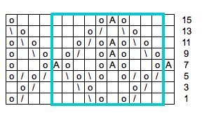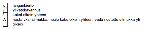 Neulo 6 kerrosta sileää oikeaa. Neulo seuraavaksi käännekerros eli *2 silmukkaa oikein yhteen, langankierto*. Neulo 15 kerrosta sileää. Neulo seuraavaksi varren kuviokerros kaavion mukaan. Kaavio toistuu sukan varressa 7 kertaa ja se neulotaan kerran. Kaaviossa on vain joka toinen kerros, jokaisen kaaviokerroksen jälkeen neulotaan yksi kerros sileää oikeaa. Neulo vartta vielä noin 6 cm ja aloita kantapää.
