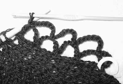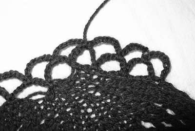 siirry viimeisen kaaren keskeltä sen juureen virkkaamalla 3 kiinteää silmukkaa kaareen,