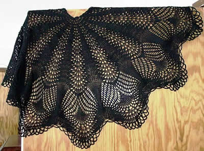 Yarnover.netin Peacock's Tail Doilyn nähtyäni sain idean muuntaa tuon vanhan vintage-mallin 3/4-ympyrän muotoiseksi huiviksi. Liinassa mallikerta toistuu 16 kertaa, huivin 3/4-ympyräversiossa 11 kertaa, joten huivi ei teoriassa ole aivan 3/4-ympyrä, mutta käytännössä saattaa mennä alaosastaan ylikin puikkokoon muutosten takia. Musta versio huivista sai ensin nimen Musta leski, mutta sitten huomasin, että Musta leski -niminen huivi oli jo olemassa. Halusin antaa huiville myös väristä riippumattoman nimen, joten huivista tuli Panache. Sana on ranskaa ja tarkoittaa sulkaa (plume).