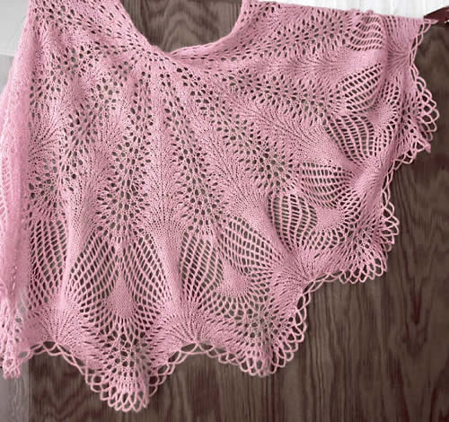 Vaaleanpunainen huivi on neulottu Pirta-konelangasta 68 tex x 3 (Nm 3/15) 100g = n. 500 m. Huivin suurin pituus niskasta alareunaan on 70 cm ja langan menekki 154 grammaa eli noin 770 metriä.