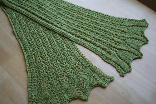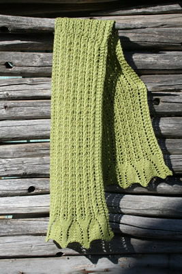 Pura apulanka huivin toisesta päästä ja poimi silmukat puikolle (47 silmukkaa). Neulo kaavion 1 mukaan yhtä pitkään kuin huivin ensimmäisessä osuudessa. Kuvio ei muodostu täsmälleen samaan kohtaan, mutta se ei erotu valmiissa neuleessa.