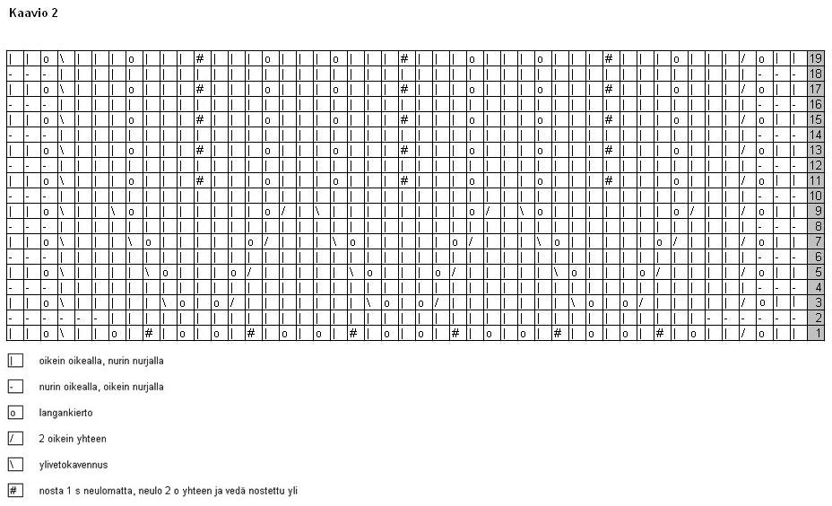 Neulo kaavio 2 kerran. Kaavio 2 muodostaa huivin päähän tulppaania muistuttavan kuvion. Neulo viimeiseksi oikean puolen kerros eli kerros 19.
