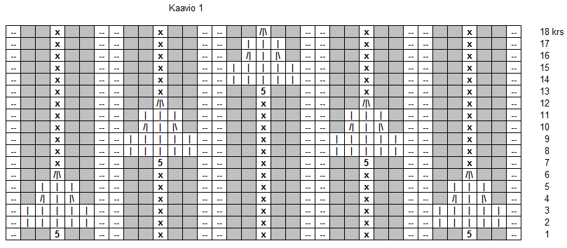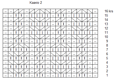 Luo 3,5 mm sukkapuikoilla 39 s. Yhdistä pyöröneuleeksi ja neulo 1 o kiertäen, 1 n -joustinneuletta 10 krs eli n. 3 cm. Vaihda työhön 4 mm puikot. Neulo sileää oikeaa 11 s, neulo 17 s kuvioneuletta kaavion 3 mukaan, neulo sileää oikeaa 11 s. Lisää kerroksen vaihtumiskohdan molemmin puolin yhden silmukan päässä vaihtumiskohdasta 9 x 1 s joka 7. krs = 57 s. Silmukkamäärä lisääntyy näin 2 s jokaisella lisäyskerroksella.