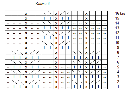 Vaihda työhön 4 mm puikot ja aloita kuvioneule kaavioiden mukaan. Aloita neulomalla puolet kaaviosta 3 (kaaviossa punaisen pystyviivan vasen puoli), neulo kaavio 2, kaavio 1, kaavio 2 peilikuvana ja toinen puoli kaaviosta 3. Nyt olet toisen sivusauman kohdalla. Neulo toinen puoli samalla tavalla.