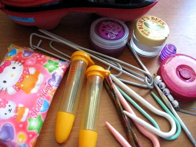 Lankojen ja puikkojen lisäksi tarvitsee tietysti kaikenlaista pientä muutakin. Ajattelin, että voisimme tehdä pienen inventaarion neuletarvikepussukkaani Henriettaan eli kotoisammin Henkkaan. Kurkataanpas, mitä Henkka on syönyt.