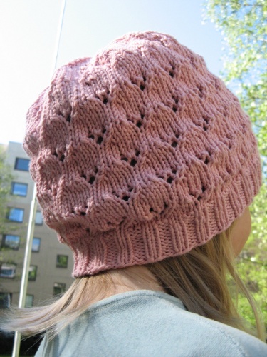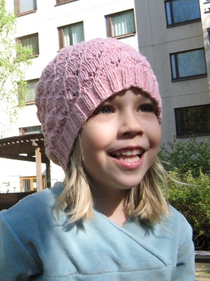 ja kesämyssyn väriksi valikoitui hento roosa. Puuvillaista hattua koristaa pienikuvioinen