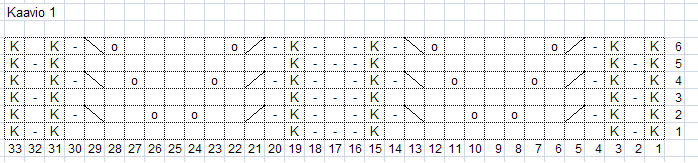 Tarkasta, missä kohtaa olet kaaviossa 1. Jos olet muulla rivillä kuin rivi 6, neulo puikolla 1 seuraavasti: Neulo 5 s oikein, jatka alempaa alkanutta 3 s.ainaoikeaa neuletta (neulo ko. silmukat jokatoisella kierroksella oikein, joka toisella nurin.), 15 s oikein, 3 s ainaoikeaa neuletta, 5 s oikein, kunnes olet neulonut myös rivin 6 kaaviosta 1.