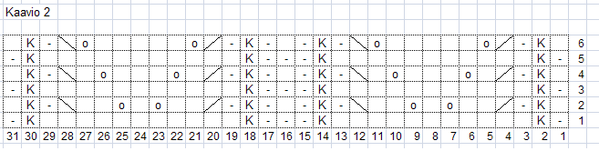 Toista näitä kahta kerrosta, kunnes puikolla 1 on 31 s. Huomioi, että *-* välisessä kohdassa silmukkamäärä pienenee joka vähennyskerroksella.