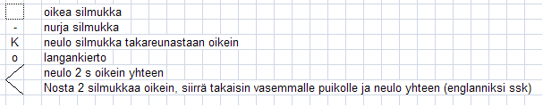 2. krs: nosta 1 s, 2 s oikein, 25 s nurin, 2 s oikein, nosta 1 s.