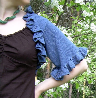 Alkaa kuin huivi, päättyy kuin bolero. Tarvitsin kesämekon seuraksi jotain pientä lämmittävää hartioiden peitoksi. Huivi olisi kiva, mutta ei aina oikein pysy paikoillaan. Miten olisi kolmiohuivi hihojen kanssa? Röyhelöä reunaan? Niin alkoi syntyä Solina-bolero. Miehusta ja hihat ovat nopeasti neulottavia, mutta röyhelöt ottavat vähän enemmän aikaa suuren silmukkamääränsä takia. Suunnittelin mallineuleen niin, että röyhelö näyttää molemmin puolin samanlaiselta.