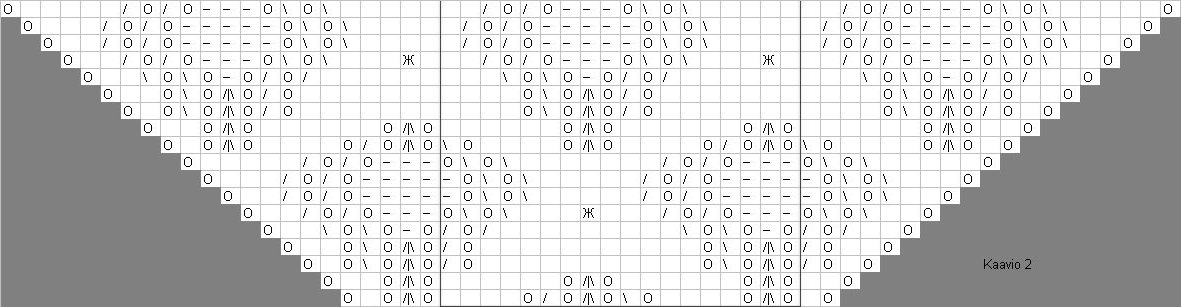 Neulo huivi kaavioiden mukaan. Kaaviossa on esitetty huivista vain toinen puolikas. Neulo siis seuraavasti: 2 reunasilmukkaa oikein, kaavio, 1 keskisilmukka oikein, kaavio, 2 reunasilmukkaa oikein. Nurjia kerroksia ei ole piirretty kaavioon. Ne neulotaan nurin, lukuun ottamatta reunasilmukoita, jotka neulotaan aina oikein.