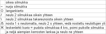 Kun olet neulonut kaavion 4 viimeisen kerroksen ja olet siis nurjalla puolella, päättele huivi seuraavasti: 1 o *1 o, siirrä silmukat takaisin vasemmalle puikolle ja neulo ne takareunoista yhteen* toista tähtien välistä osuutta, kunnes jäljellä on yksi silmukka.
