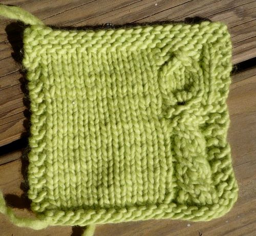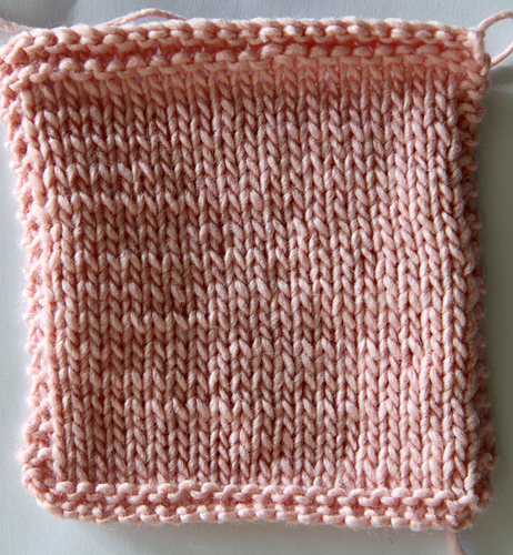 Kastelin tilkun ja annoin sen kuivua pingottamatta. Märkä tilkku venähti melko paljon, mutta palautui kuivuessaan lähes entiselleen. Kuivana tilkun tiheys oli 16 s ja 24,5 krs kymmenellä sentillä. Mallitilkku pörröttyi hieman kasteltaessa ja neulepinta tasaantui. Sormilla hieromalla mallitilkkuun ei saanut syntymään nyppyjä.