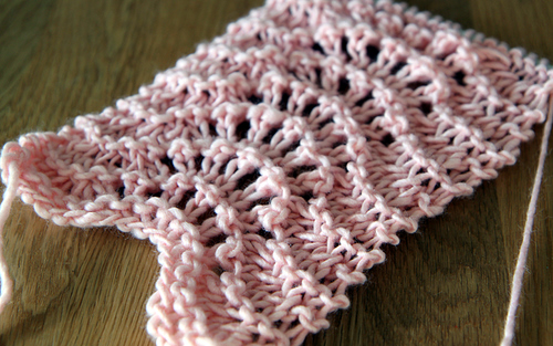 Aloitin langasta myös kapean kaulaliinan 7 mm muovipuikoilla. Muovipuikoilla langan kulku on tahmeaa. Testasin huiviin useaa mallineuletta. Purkaminen ja uudelleen neulonta ei vaikuttanut langan ulkonäköön. Lopulta päädyin 18 silmukan feather and fan –mallineuleeseen. Suurempi puikkokoko ja löyhempi tiheys toimivat hyvin valitussa mallineuleessa. Huivista näyttää tulevan mukavan ilmava ja kevyt. Yksi vyyhti riittänee hyvin seitsemänvuotiaalle tytölle tulevaan huiviin.