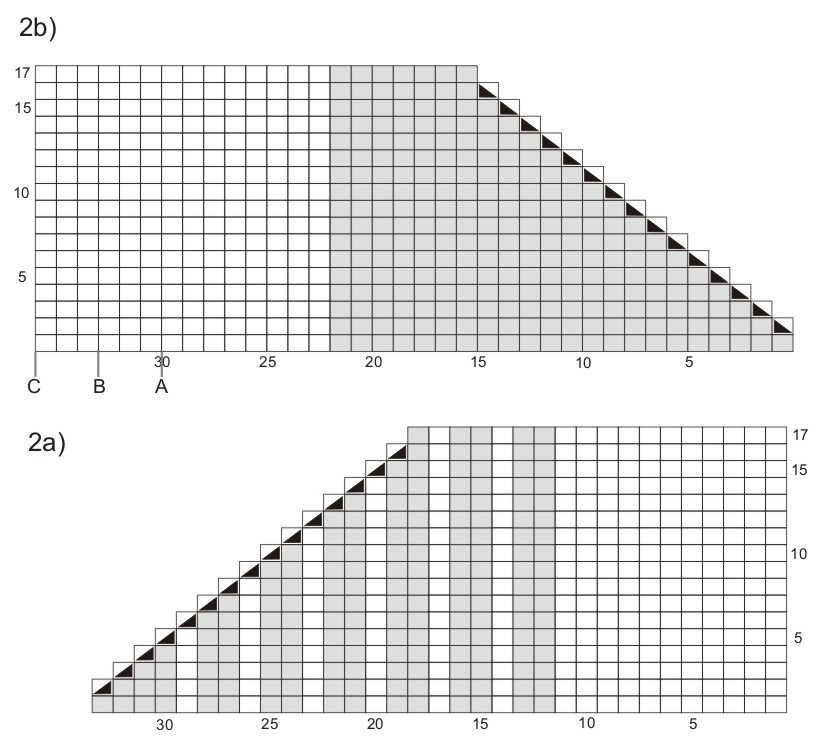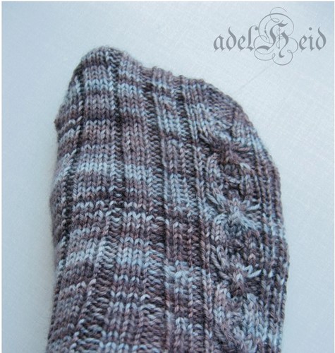 Poimi kantalapun reunoista 22 s kummaltakin puolelta ja jaa ne yhdessä kantapohjan silmukoiden kanssa tasan 1. ja 2. puikolle. Neulo 1. puikolla 2 b) -kaaviota (sisäsyrjä), 2. puikolla 2 a) -kaaviota (ulkosyrjä) ja 3. ja 4. puikolla edelleen 1. kaaviota. 2 b) -kaaviossa on merkitty kokojen A – B – C päättyminen 1. puikolla.