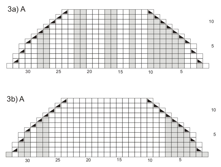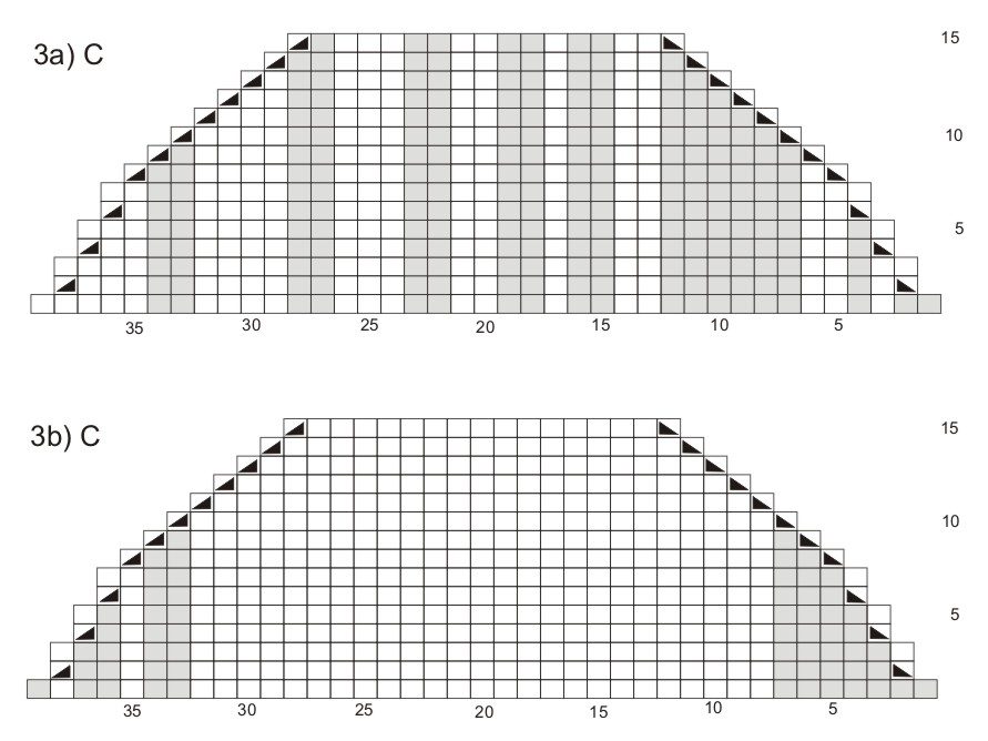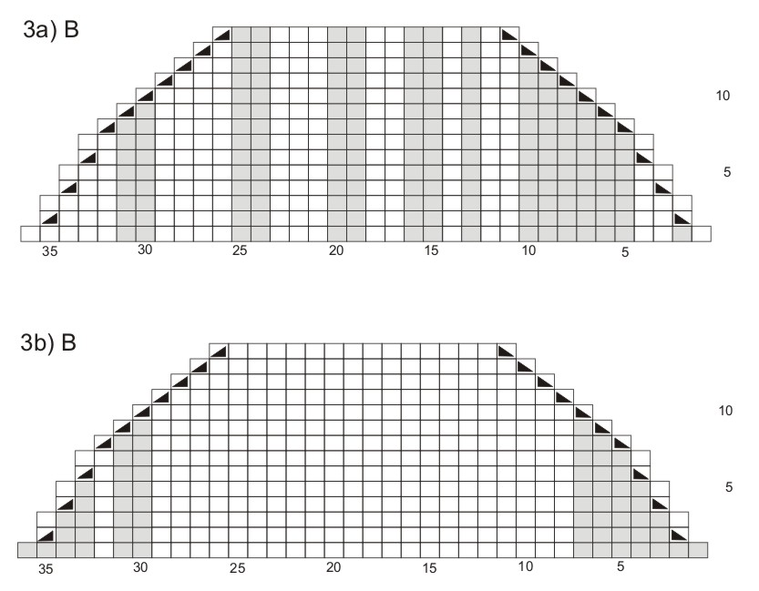 Neulo 1. ja 2. puikolla 3 b) -kaaviota (pohja) ja 3. ja 4. puikolla 3 a) -kaaviota. Kun jäljellä on 30 – 32 – 34 s, katkaise lanka ja päättele se silmukoimalla.