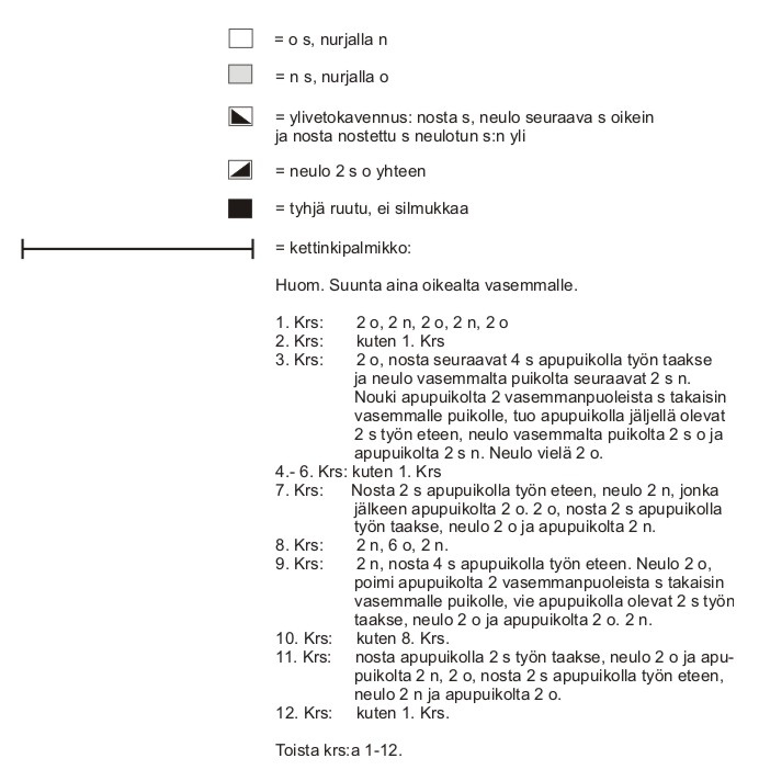 - . krs: *1 o, nosta 1 s*. Toista *-* 2. puikon loppuun loppuun. Neulo viimeinen s oikein. Käänny.