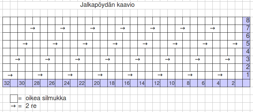 2 re = Kaksi silmukkaa etukautta ristiin eli neulo ensin toisena puikolla oleva silmukka etukautta oikein, sen jälkeen ensimmäinen silmukka oikein.