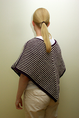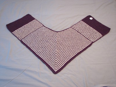 Toista kerroksia 1-2 siten, että aina 2. krs:n keskellä neulot kolme s yhteen. Neulo raidat neulomalla aina 1. ja 2. krs samalla värillä, jolloin langanvaihdot juoksevat vain toisessa reunassa. Kun jäljellä oleva sisäkulma on 15 + 15 cm, päättele silmukat.