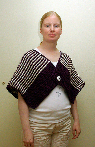 Aloitin dominoneliön (Suuri Käsityölehti 4/06) ohjeella luomalla niin monta silmukkaa kuin 35 cm puikoille sain mahtumaan. Aloitussilmukat muodostavat neliön kaksi sivua. Niskan kohta syntyy jättämällä neliö hieman kesken. Etupuolelle tulevat lisäsiivet voi neuloa poimimalla silmukat työn reunasta tai erillisinä kappaleina.