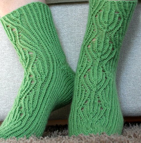Sukissa kaikki oikeat silmukat, lukuun ottamatta jalan alla olevaa sileää oikeaa, neulotaan kiertäen oikein. Se tuo kuvion paremmin esiin.