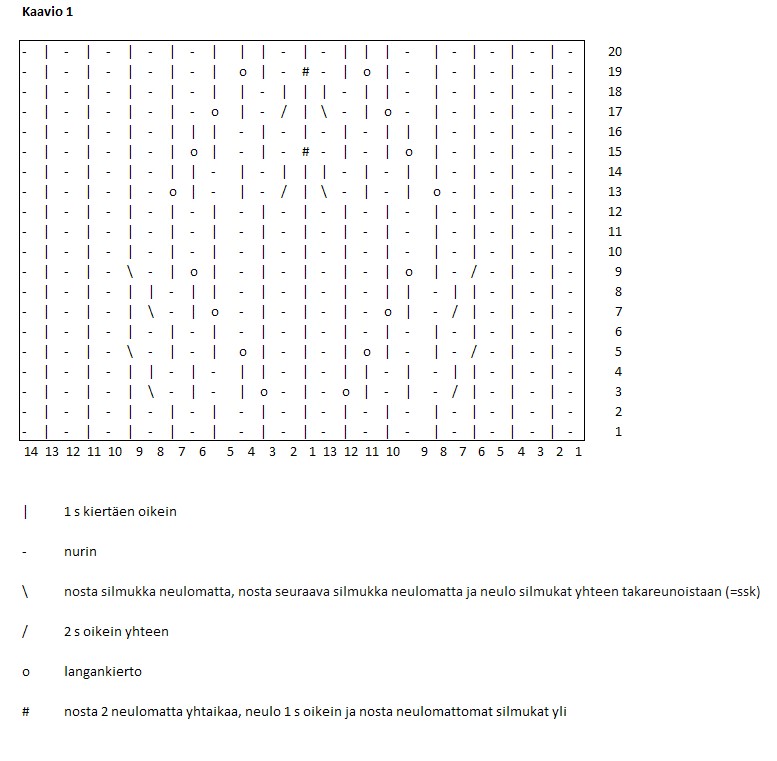 Aloita kärkikavennukset, kun olet viimeiseksi neulonut kaaviosta 1 kerroksen 20. Neulo vielä koko kerroksen 1. ja viimeinen silmukka oikein yhteen.