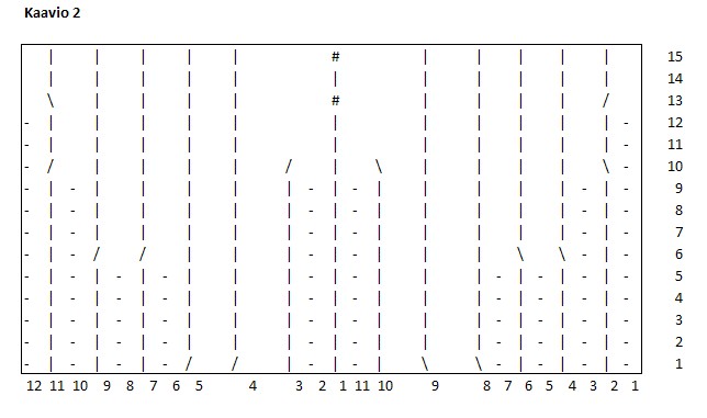 Jatka 1. ja 4. puikoilla joustinta kuten edellä ja aloita 2. ja 3. puikoilla kaavion 1 neulominen. Aloita kerrokselta 1. Toista kaavio kerran. Toista kaaviota vielä toisen kerran kerrokselle 10 saakka (niin että neulot vielä 10. kerroksen). Aloita sitten kantapää 1. ja 4. puikoilla.