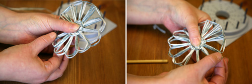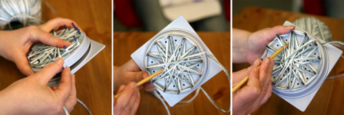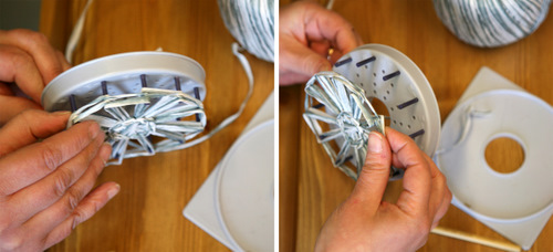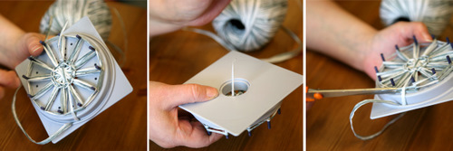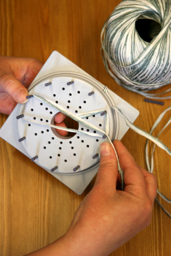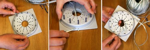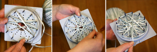 Aseta pitsikukkakehikkoon tappi jokaiseen ulommaiseen reikään (12 kpl). Kieputa lanka 1,5 kertaa kehikon ympäri. Pujota "häntä" keskireiästä ja laita se kehikon väliin niin ettei se pääse karkuun.