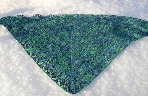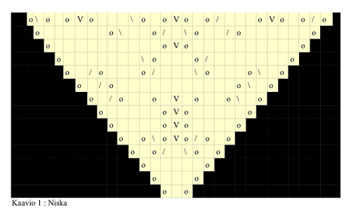 Jos haluat kärjestä aloitetun huivin, luo 5 s haluamallasi tavalla. Neulo 6 krs aina oikein -neuletta. Neulo sitten 2 reunasilmukkaa, kaavio 1 vain kerran ilman keskisilmukkaa, 2 reunasilmukkaa. Jatka neulomalla kaaviota 2 kunnes huivi on haluamasi kokoinen. Neulo sitten vielä 6krs aina oikein-neuletta ja päätä silmukat löyhästi.