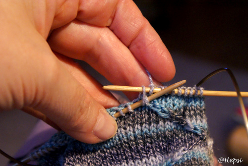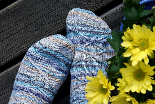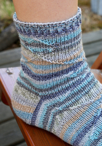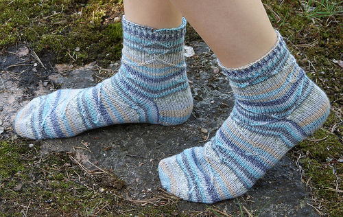 on aloitettu kärjestä. Kuvio on toteutettu yhden silmukan palmikolla. Ajatus lähti siitä, että halusin neuloa kesäsukat itseraidoittuvasta