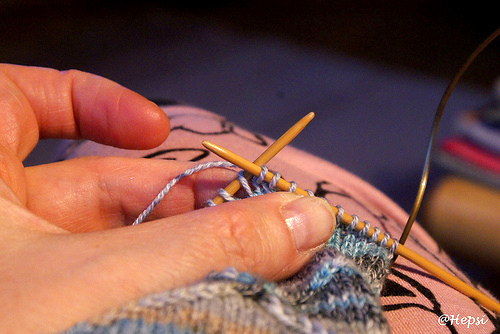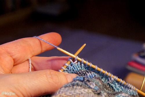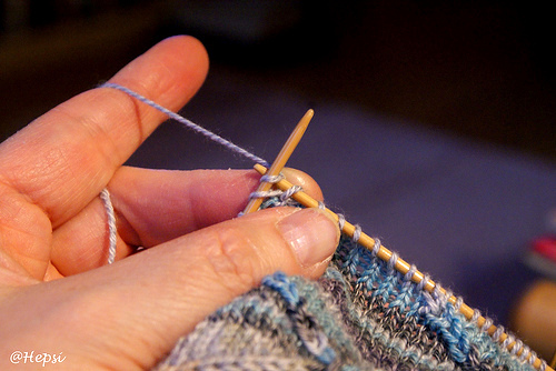 Luo 20 s (10 kummallekin puikolle) joko Ullan 03/05 ohjeen Sukanneulominen kärjestä ylöspäin tai Ullan 02/06 ohjeen kahdeksikkoaloitus mukaan. Neulo sileää neuletta eli kaikki silmukat oikein.