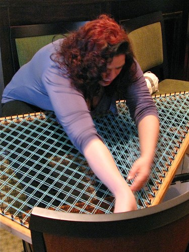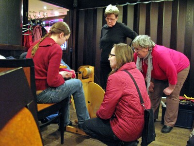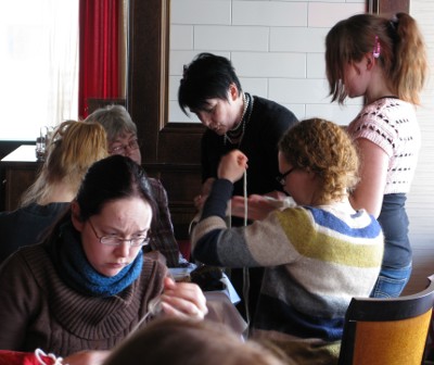 Ja osattiinhan niitä. Kissojen yö -tapahtumassa oli useita erilaisia työpajoja ja näytöstyyppistä kädentaitojen esittelyä. Päästiin kokeilemaan pussukoiden ompelemista ja perinteisempiäkin menetelmiä kuten koukkuamista, kehräämistä, sukkulapitsiä ja peräti kinnasneulailua. Ihmetystä ja ihastusta aiheutti etenkin paikalle saatu miespuolinen käsityöläinen, jonka kehruutaitoja ja värttinän pyörittämistä keräännyttiin ihailemaan sankoin joukoin. Työpajat olivat käytännössä puoli-ilmaisia, joten pienelläkin budjetilla sai kokea elämyksiä pitkän ajan tarpeisiin ja tarjolla oli ihan taatusti ainakin poikkeuksellisen hyvää seuraa, käteviä neuvoja ja leppoisaa ilmapiiriä. Välillä pidettiin tietysti taukojumppa, jotta jäsenet eivät ehtisi jäykistyä liiaksi, ja aina silloin tällöin hiippaili joku ihan kuin puolihuolimattomasti ja vähän itseltäänkin salaa tekemään paikalla olleilta mainioilta käsityömateriaalien ja -tarvikkeiden myyjiltä mahdottoman tarpeellisia tai ainakin ehdottomasti hyvää mieltä ja mukavia hetkiä tuottavia hankintoja.