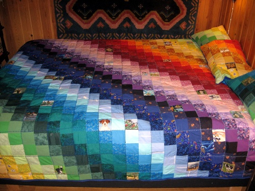 Sitten SE tapahtui. ISO INSPIRAATIO. Unohdin koko kodinsisustusidean ja siisteyskampanjan. Parissa viikossa väsäsin tilkkupeiton jossa oli 38 x 38 palaa, kukin pala 8 cm x 8 cm. Kankaita oli peittoon käytetty 38 erilaista ja lisäksi summittaisesti lisättynä kuviopalasia, traktoreita, kissoja, koiria, mitä vain hyllystä löytyi. Koottuani kaikki palat peitoksi leikkasin sen kokoon 210 cm x 230 cm. Yli jääneistä kankaankaistaleista tein 5 kpl tyynynpäällisiä, joissa on vetoketju reunassa. Sisällys on säkkituolin styrox-palloja kangaspusseissa.