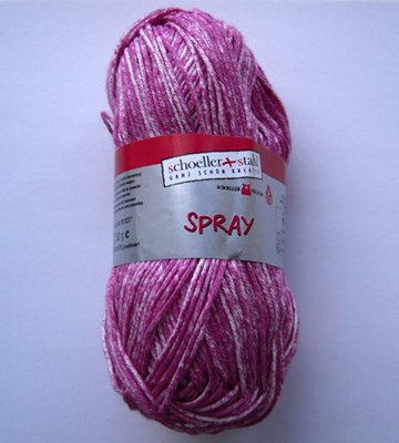 Spray on nimensä mukaisesti ruiskuvärjättyä puuvillaa. Kerällä lanka näyttää mielenkiintoiselta: hieman siltä, kuin värjäysprosessi olisi mennyt pieleen ja väripadasta on noussut vain puoliksi värjättyä lankaa. Neulepinnasta tulee kuitenkin elävää, muttei läikikästä.