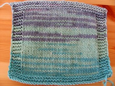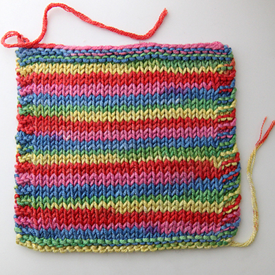Kuvan mallitilkussa tiheys on 21 s ja 32 krs kymmenellä sentillä. Ennen pesua tiheys oli 23 s ja 30 krs. Mallitilkussa on 30 s, molemmissa reunoissa on 3 s reunus aina oikein -neuletta. Smiley Stripes -langassa on sama koostumus ja ohjetiheys kuin Sirdarin Snuggly Baby Bamboo DK -langassa. Baby Bamboo -langassa on paljon laajempi värikartta.