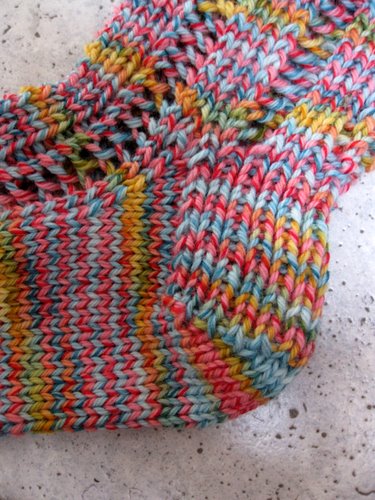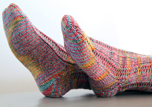 päätyneistä riemunkirjavista langoista sukat, mutta jotain muuta kuin sileää. Monivärinen