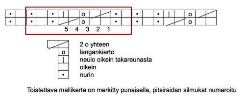 Luo 54 s, jaa silmukat neljälle puikolle (14-13-13-14) ja neulo pitsikuviota kaavion 1 mukaan. Kaaviossa toistettava alue on merkitty punaisella. Varteen tulee 6 pitsiraitaa. Neulo vartta sopivasti oman makusi mukaan. Mallisukissa varren pituus on 12 cm.