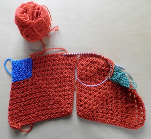 Poimi sitten vihreäkulmaisen tilkun sivusta 28 s, luo 1 s ja poimi sitten sinikulmaisen tilkun sivusta 28 s. Kuvassa on poimittu vihreäkulmaisen tilkun silmukat ja osa sinikulmaisen tilkun silmukoista.