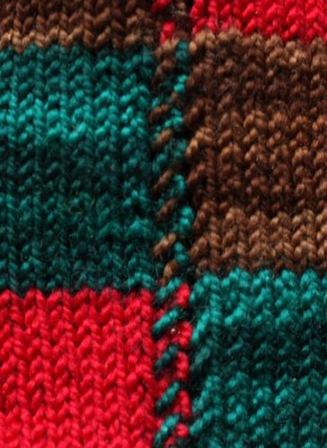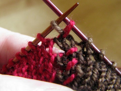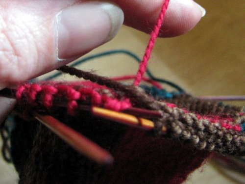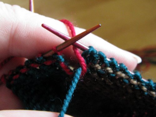 Käännä nyt työ kädessäsi niin, että sukan suu on sinuun itseesi päin. Älä nosta kerroksen ensimmäistä neulomatta, vaan neulo kaikki silmukat nurin. Muista vaihtaa tilkkuvärejä aina työn edetessä! Värin vaihtamiskohdassa nurjalla kerroksella ota uusi värilanka aina käyttöön niin, että vanha väri jää uuden taakse.