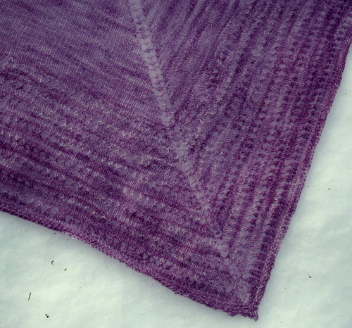 Tee tällainen reikäkerros joka 8. kerroksella. Neulo muilla kerroksilla sileää neulosta kuten huivin alkuosassa. Mallihuiviin on tehty 8 reikäkerrosta.