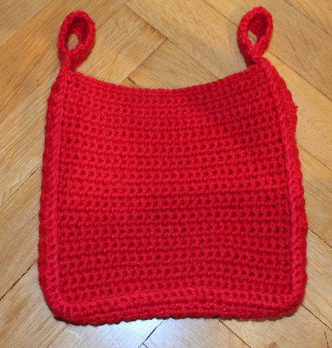 Virkkaa kaksinkertaisella langalla 30 kjs. Käytä viimeinen kjs työn kääntämiseen eli käännä työ ja hyppää yhden kjs yli. Toisella kerroksella virkkaa ks jokaiseen kjs:aan (eli 29 ks). Tee 1 kjs ja käännä työ. Virkkaa ks jokaiseen edellisen kerroksen kiinteään silmukkaan. Jatka, kunnes kappale on 18,5 cm korkea eli pala on neliö. Katkaise lanka ja vedä silmukan läpi.