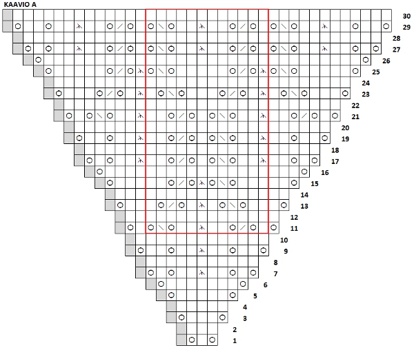 A-sektori: neulo kaavio A kerran alusta loppuun, sen jälkeen kerrokset 11-30 kolme kertaa ja lopuksi vielä kerrokset 11-28 kerran. Huomaa, että aloittaessasi viimeistä kertaa kaavion A kerrosta 19 B- ja C-sektoreissa siirrytään B2- ja C2-kaavioihin.