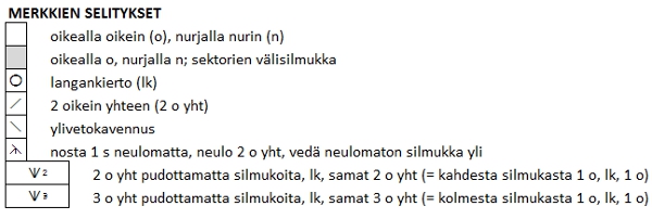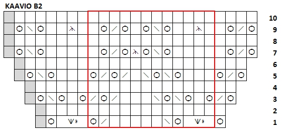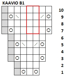 B-sektorit: neulo kaavio B1 kerran alusta loppuun, sen jälkeen kerrokset 7-10 vielä 22 kertaa (= 51 s molemmissa B-sektoreissa sektorien välisilmukoiden välissä). Siirry tämän jälkeen neulomaan B2-kaavion mukaan. (B2-kaavio alkaa, kun A-sektorissa on neulottu viimeisen kerran kaavion A kerros 19.)