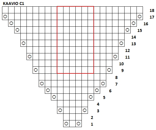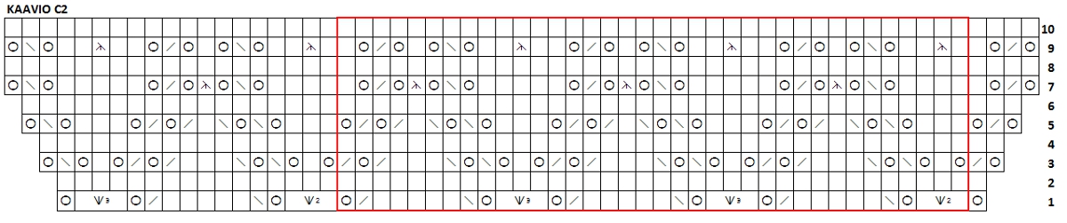 C-sektori: neulo kaavio C1 kerran alusta loppuun ja sen jälkeen kerrokset 9-18 vielä kahdeksan kertaa (= 119 s reuna- ja sektorin välisilmukoiden välissä). Siirry tämän jälkeen neulomaan C2-kaavion mukaan. (C2-kaavio alkaa, kun A-sektorissa on neulottu viimeisen kerran kaavion A kerros 19.)
