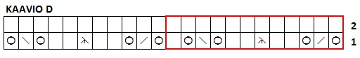 Reunusta varten tarvitset vain reunuskaavion D. Neulo reunasilmukoiden sisäpuolelle jäävillä silmukoilla kaavion D mukaan; toista punaisella kehystetty alue 31 kertaa. Toista reunuskaavion D kerroksia 1-2 yhteensä neljä kertaa.