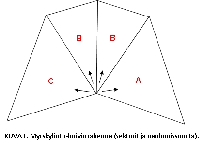 Huivi neulotaan niskasta kohti ulkoreunaa ja se koostuu neljästä sektorista (kuva 1). Sektori A on kokonaan pitsiä. Keskisektorit B ovat sileää neuletta ja identtisiä keskenään. Sektori C on sileää neuletta ja vastaa muodoltaan sektoria A. Sektorien A ja C paikkaa voi siis vaihtaa tai kumpi tahansa on korvattavissa toisella.